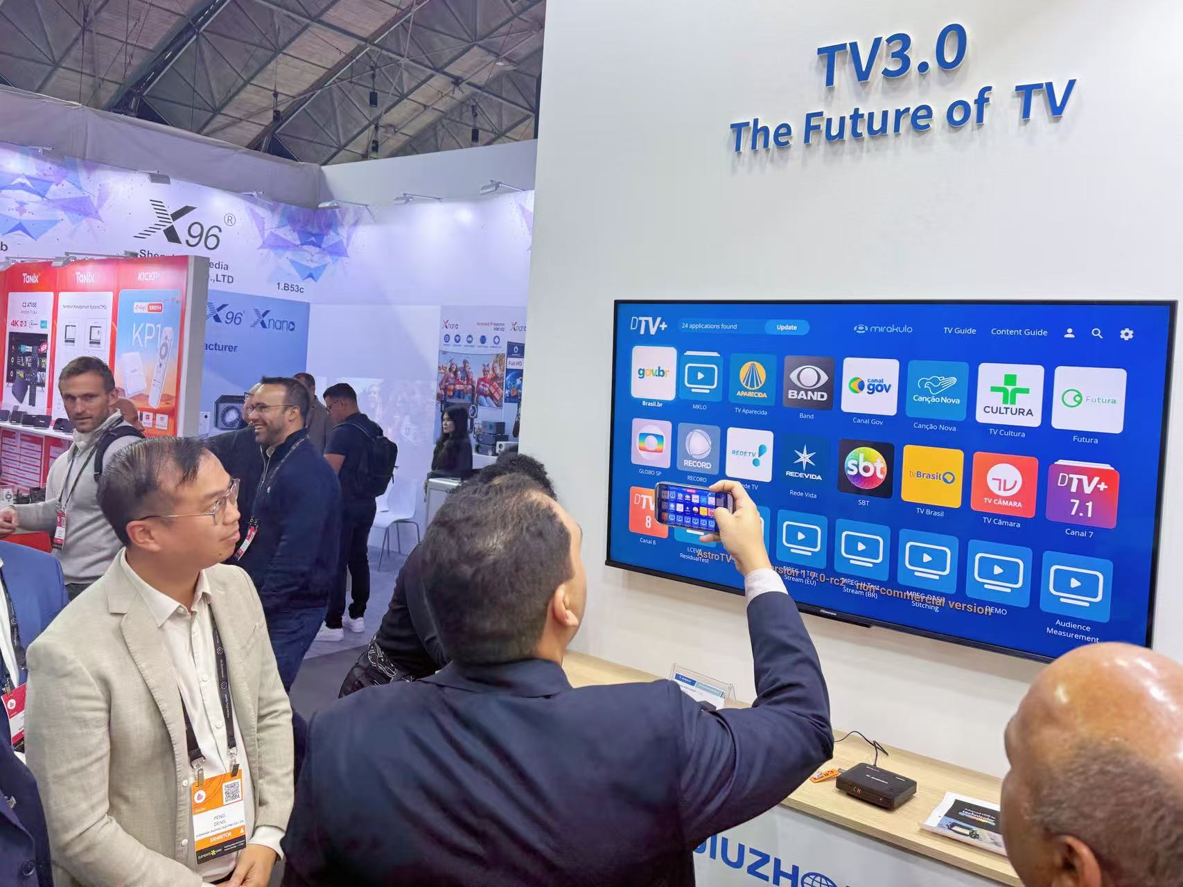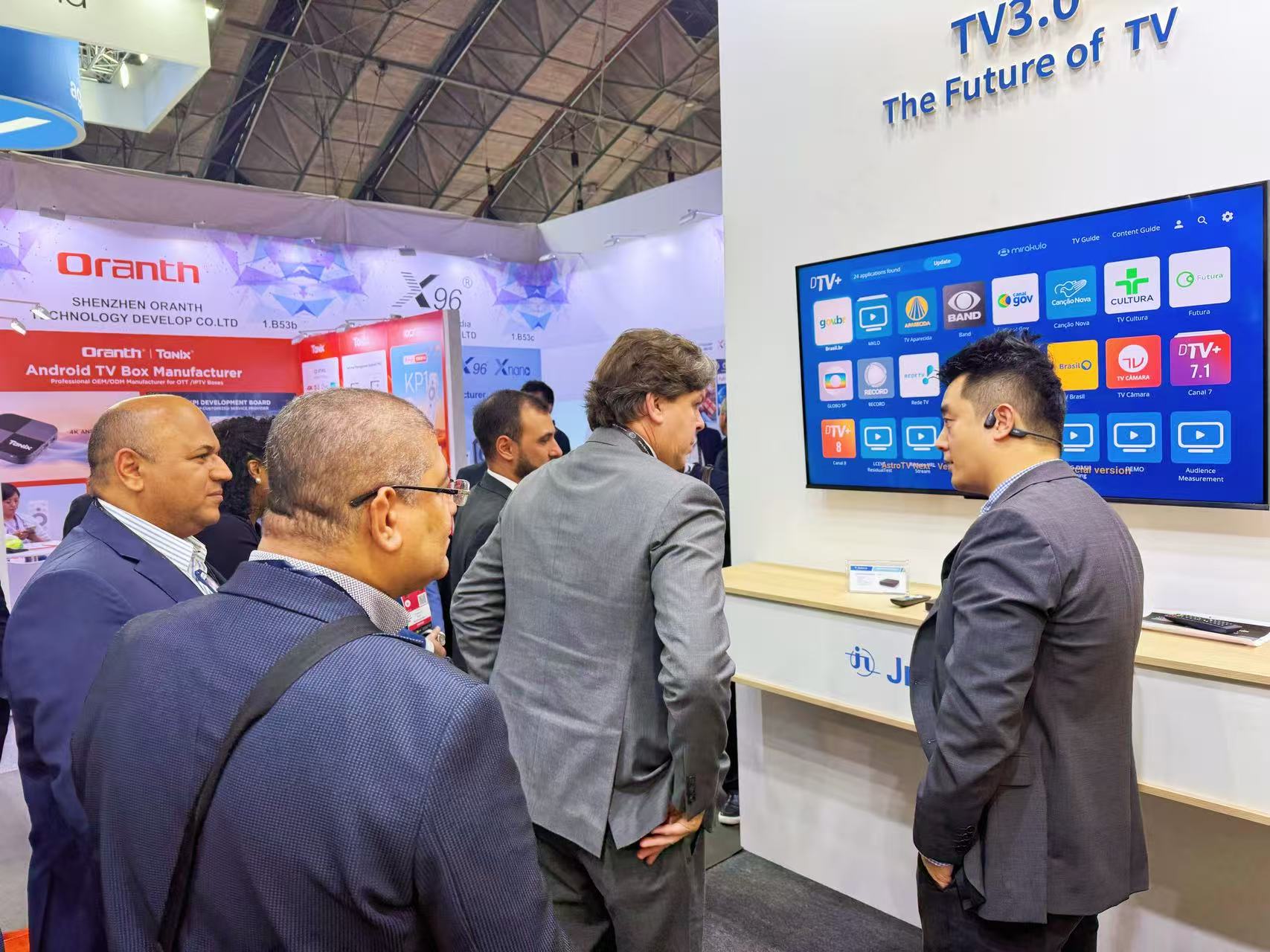 與此同時,最新研發(fā)的巴西下一代數(shù)字電視標準TV 3.0機頂盒引發(fā)高度關(guān)注 — 巴西通信部部長Frederico de Siqueira Filho駐足九洲展位,認真聆聽海外銷售團隊對該產(chǎn)品的講解。該產(chǎn)品憑借 “多標準兼容 + 超高清體驗 + 場景適配” 的核心優(yōu)勢脫穎而出:一方面解決了不同區(qū)域信號接收的適配難題;另一方面搭載 Andriod 4K 系統(tǒng),以超高清音畫技術(shù)精準還原細膩光影細節(jié)與立體聲音效,再結(jié)合多元內(nèi)容池的資源支撐,可靈活滿足家庭集體觀影、個人碎片化追劇等多樣化需求,成為本次展會中體現(xiàn) “技術(shù)適配性 + 用戶體驗感” 的代表性產(chǎn)品。