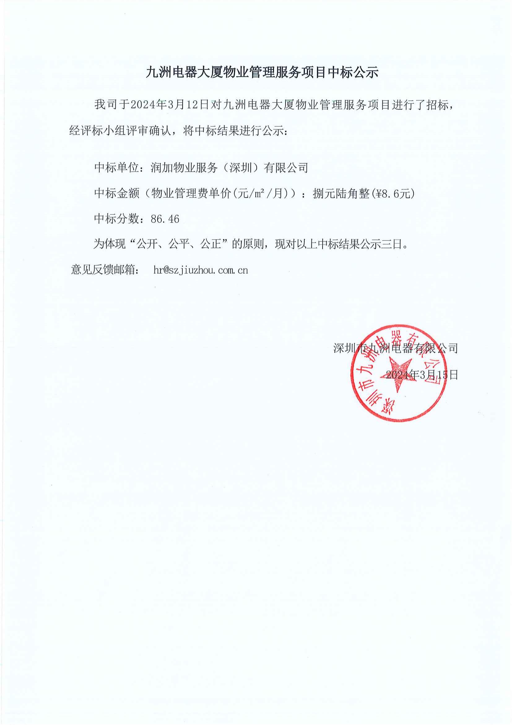 九洲電器大廈物業(yè)管理服務(wù)項目中標(biāo)公示